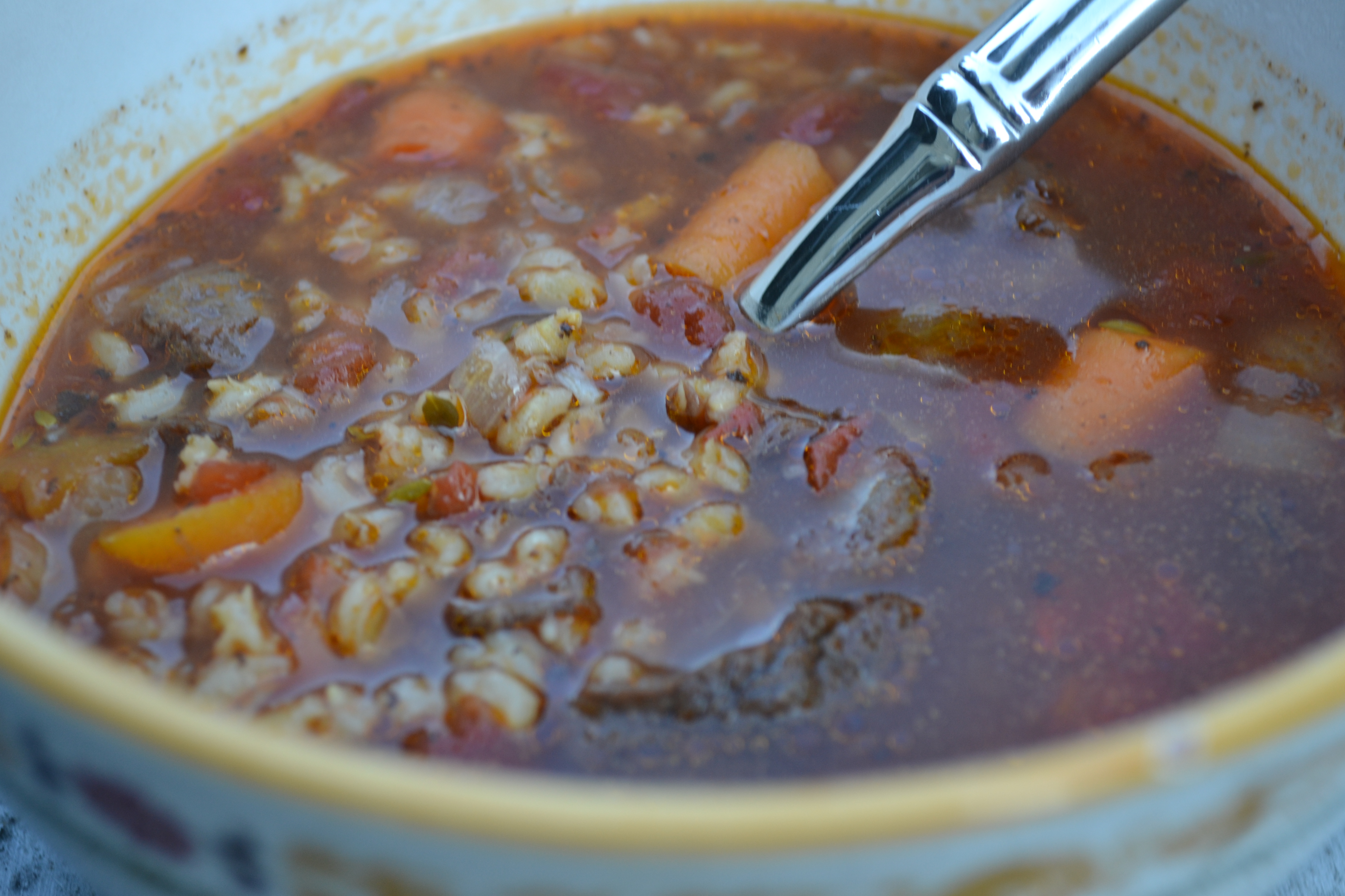 After 30 minutes, add the carrots, onions, and meat. Simmer for another 30-45 minutes or until the barley is done cooking. I like the barley al-denté, but you may like it softer.