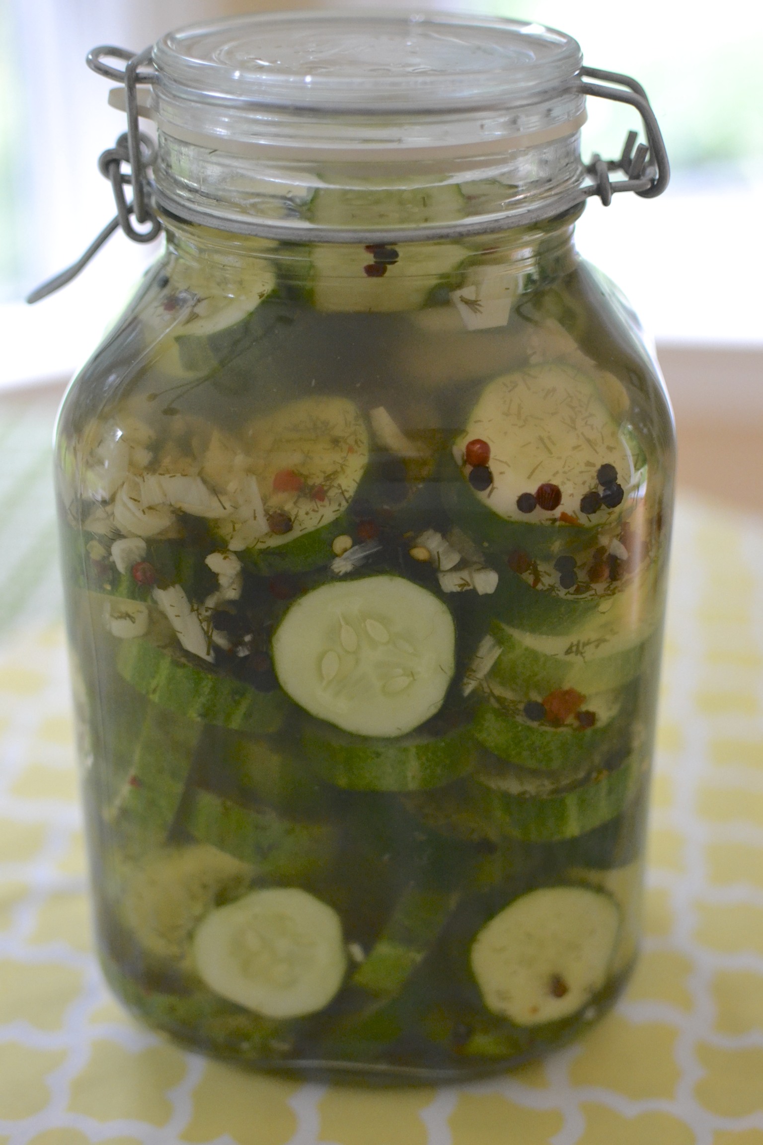 Arrange the cucumber slices in the jar and pour the cooled brine over the top. Cover and refrigerate. If you want to store them, prepare a water bath and seal the jars in the typical canning fashion. Pickles will stay fresh for a month.