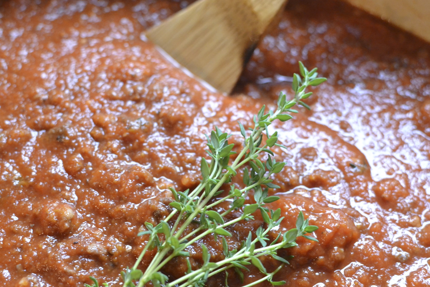 Directions: Pour the EVOO in a heavy stock pot and heat on medium-high until fragrant. Add the beef and pork to the pan and brown it, breaking up the meat with a wooden utensil as it cooks. Browned meat imparts a richer flavor so let it brown nicely. Once the meat browns, add the red wine and deglaze the pan. Turn the heat to low and allow the wine to cook into the meat for about 5-10 minutes. Add the tomatoes, tomato paste, thyme, salt, and pepper. Stir well to combine. Add the soffritto and stir completely. Bring to a low boil, then reduce to simmer. If you find it too thick, you can add water. If you find it too thin, add a bit of tomato paste.