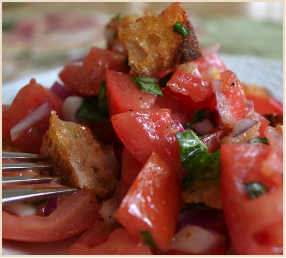 Directions for the salad: In a large serving bowl, combine the chopped plum tomatoes, red onion, basil, ¼C EVOO, and lemon juice. Season with sea salt and pepper to taste. Gently toss the ingredients. Add the croutons and toss the salad again, making sure the lemon dressing coats all the ingredients.