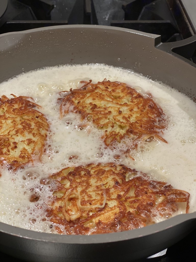 Lightly whisk the eggs with a fork and set aside. Use a heavy skillet and make sure there’s enough oil for the latkes to not sauté. You want the oil a bit deeper for frying but since you’re flipping them they don’t need to float.