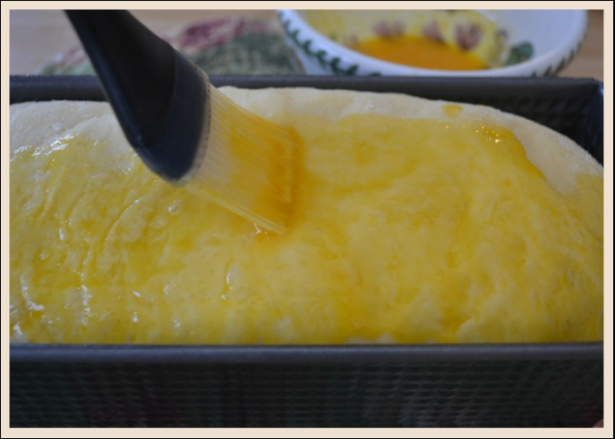 Butter a 10” loaf pan. Place the dough into the loaf pan. Loosely cover the dough again with the plastic wrap, and let it rise , about 1½ – 2 hours, or until doubled in size.
